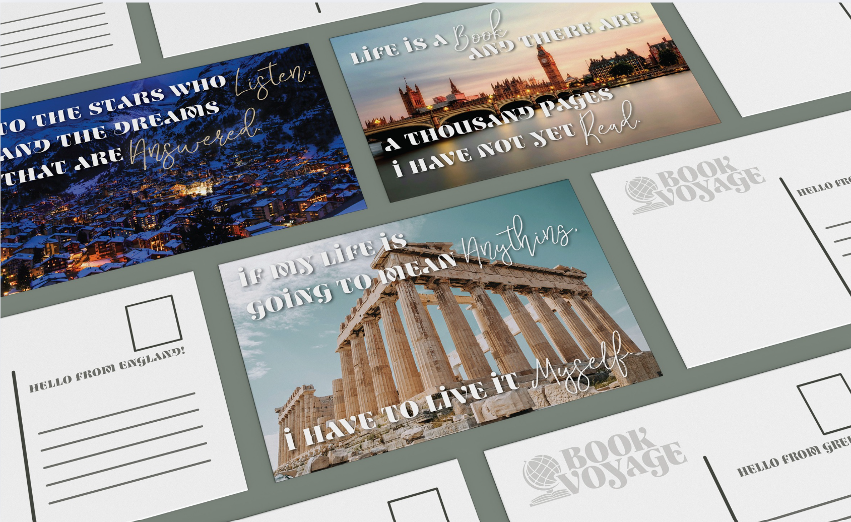 “Book Voyage” started as an idea for a travel company based around visiting the real life locations that are associated with fictional settings in books. I wanted to create a muted brand that combined the ideas of reading, travel, and adding a dark academia flare.